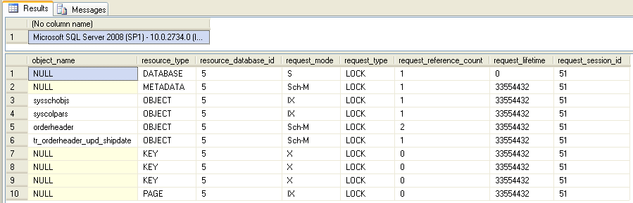 Nel trigger dbo.tr_orderheader_disable_tr viene interrogata la DMV sys.dm_tran_locks che fornisce importanti informazioni sulle risorse correntemente bloccate e sui relativi processi richiedenti il blocco, la query è stata aggiunta per monitorare i lock durante l’esecuzione del trigger, il dataset viene restituito in output.