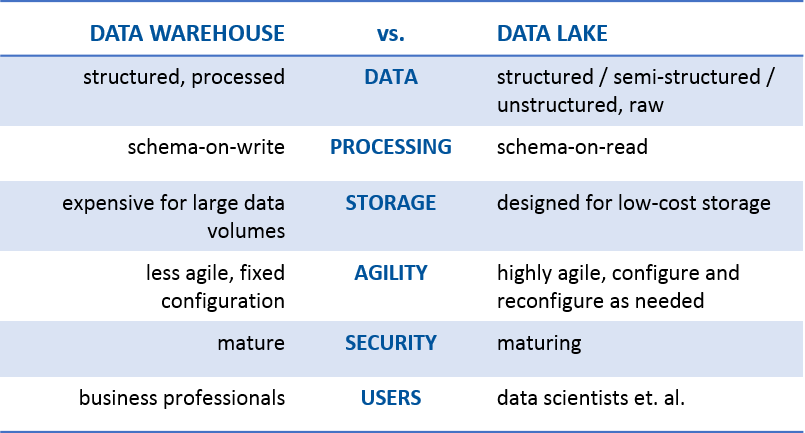 L’argomento caldo del momento, il “Data Lake” è sempre più caldo e quindi Microsoft ha programmato una serie di webcast dedicati alla soluzione offerta da Azure rispetto all’esigenza di creare e sfruttare il concetto di “Data Lake”. Una buon riassunto per capire la differenza tra un Data Warehouse ed un Data Lake è questa, definita da SAS e direi che è piuttosto sensata: