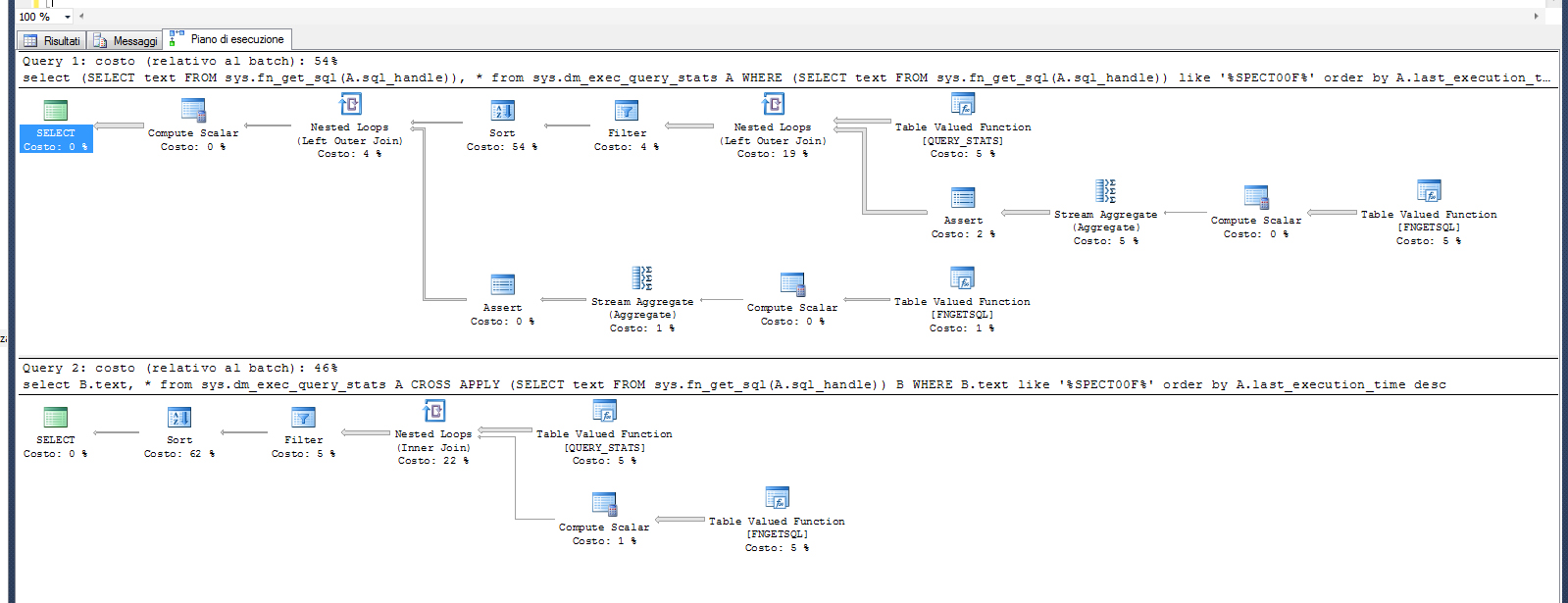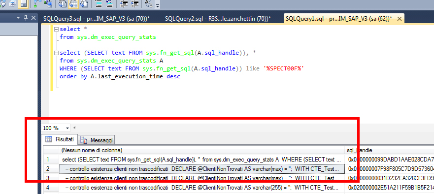 Lo statement va riscritto, magari inserendo una o più parole che possono individuare lo script che si stata scrivendo/provando: in questo caso la parola “SPECT00F”. Quindi vanno estratte tutte le query eseguite che hanno la parola chiave e ordinate per ora di ultima esecuzione (DESC) in modo da partire dalle più recenti. Senza filtro verranno estratte tutte le query memorizzate in SQL Server.