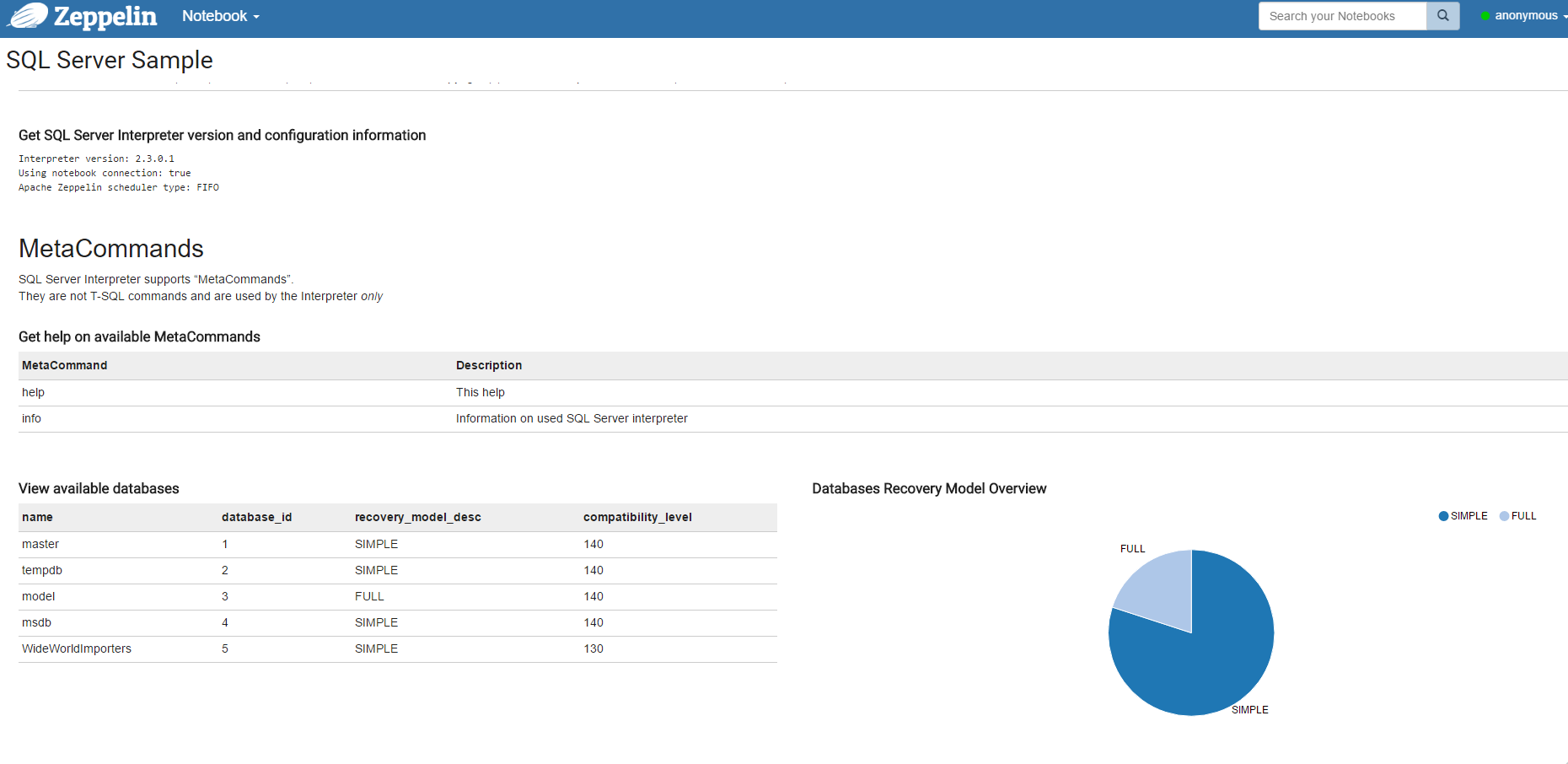 Dall’inzio del 2015 ho inziato a lavorare su un Interprete specifico per SQL Server, per poter sfruttare al 100% le possibilitá del nostro beneamato engine. Nei giorni scorsi ho rilasciato l’interprete per l’ultima versione stabile di Apache Zeppelin, la 0.6.2, e, dato che tutto é fatto in Java, per semplificare il processo di download ed installazione ho creato e pubblicato un’immagine Docker cosi che sia possibile eseguire Apache Zeppelin senza doversi preoccupare della tecnologia utilizzata per farlo funzionare.
