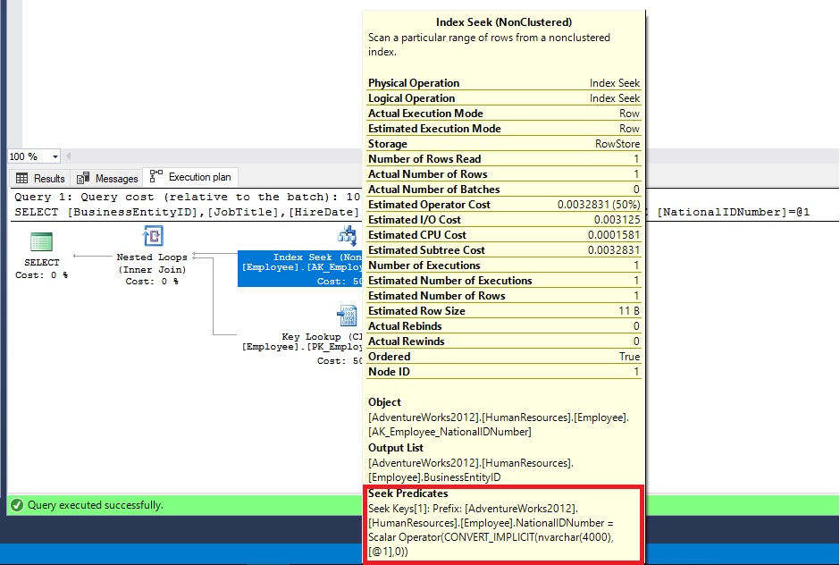 Ad una prima occhiata non sembrerebbe presentare nulla di particolare. Ma in realtà esplorando i dettagli dell’operazione “Index Seek” notiamo che il QP ha applicato la funzione CONVERT_IMPLICIT alla nostra costante riscrivendo di fatto il Seek Predicate. Ciò è dovuto all’utilizzo di un qualificatore di stringa non coerente con il tipo dato della colonna “NationalIDNumber” (NVARCHAR(15)). In particolare abbiamo utilizzato una stringa delimitata da apici singoli (‘112457891’) la quale viene identificata dal sistema come una stringa non-Unicode, mentre avremmo dovuto utilizzare una stringa delimitata da apici preceduti da una lettera N (maiuscola) (N'112457891’) la quale indica invece una stringa di caratteri Unicode e quindi in accordo con il tipo dato della colonna.