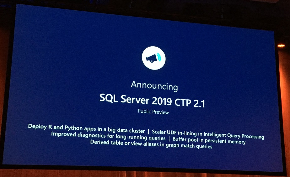Annunciata la scorsa settimana durante la Keynote Day 1 al PASS Summit 2018, la CTP 2.1 di SQL Server 2019 è disponibile per il download da SQL Server Evaluation Center.