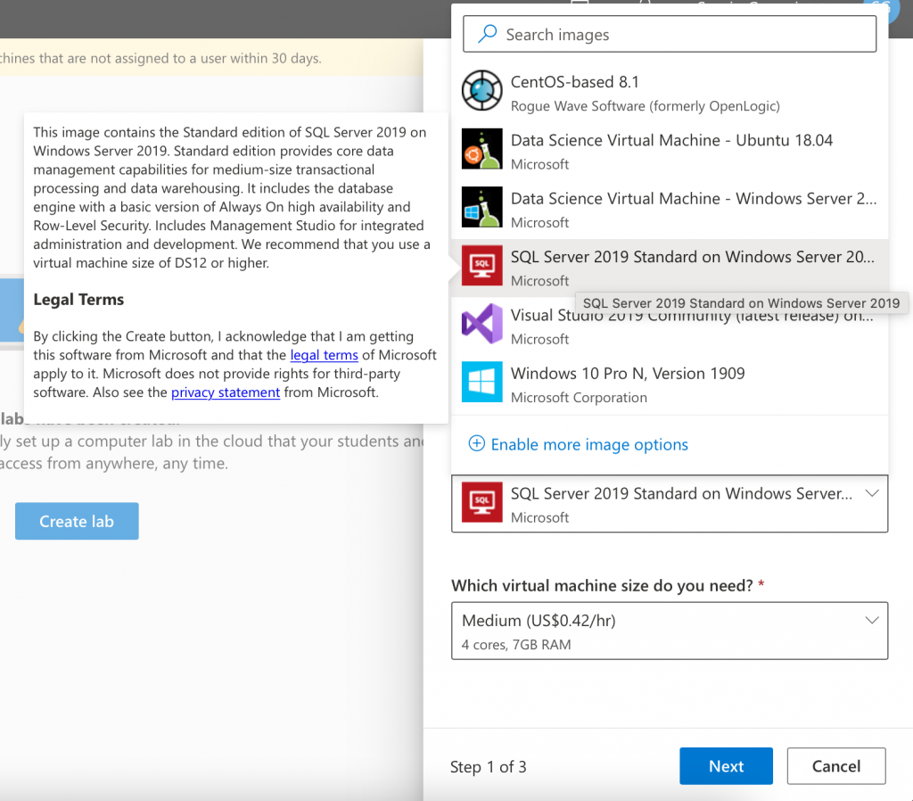 In entrambi i casi, si consiglia l’utilizzo della size Medium come dimensione minima per le VM del laboratorio SQL Server.