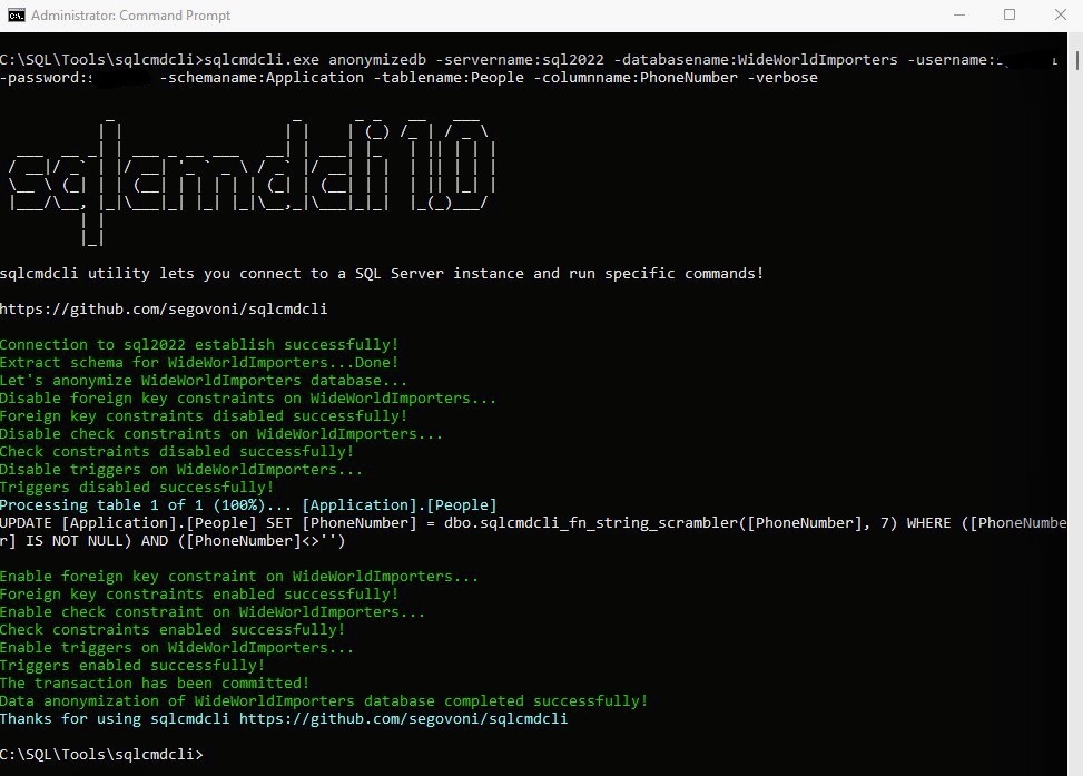 sqlcmdcli.exe anonymizedb -servername:sql2022 -databasename:WideWorldImporters -username:xxxxx -password:xxxxx -schemaname:Application -tablename:People -columnname:PhoneNumber -verbose