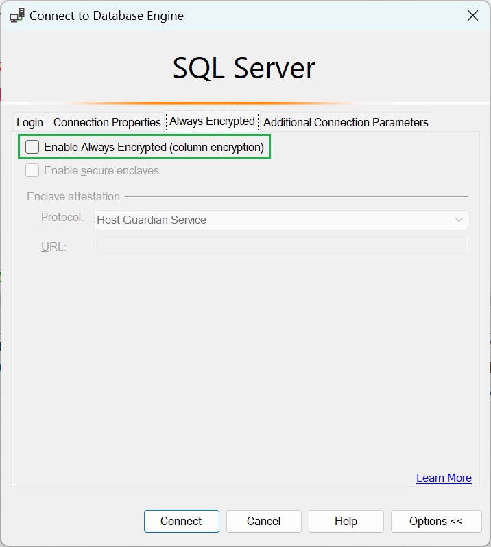 Usiamo SQL Server Management Studio per simulare l’applicazione che gestire il database AlwaysEncryptedDB. Apriamo una nuova finestra Query e dopo aver specificato le credenziali per connetterci all’istanza SQL Server, selezioniamo la scheda Always Encrypted e accertiamoci che l’opzione Enable Always Encrypted (column encryption) sia disabilitata come illustra la figura seguente.