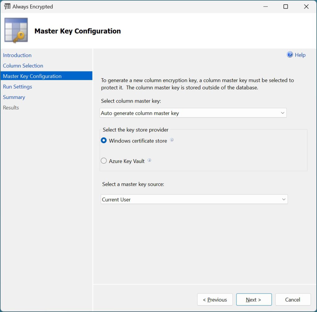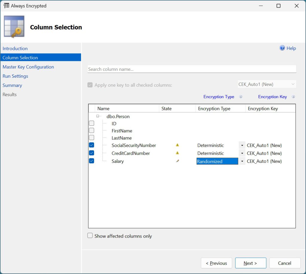 SQL Server Management Studio offre una procedura guidata che consente di configurare facilmente Always Encrypted per le colonne che memorizzano dati sensibili configurando: