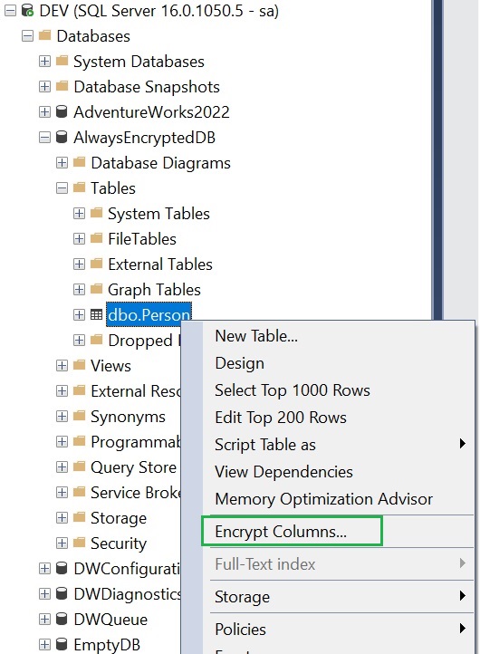 Per avviare il processo di crittografia usando SSMS (si consiglia l’ultima versione rilasciata), raggiungere la tabella dbo.Person del database AlwaysEncryptedDB, fare clic con il tasto desto del mouse sulla tabella, scegliere Encrypt Columns e avviare la procedura guidata di Always Encrypted come illustra la figura seguente.