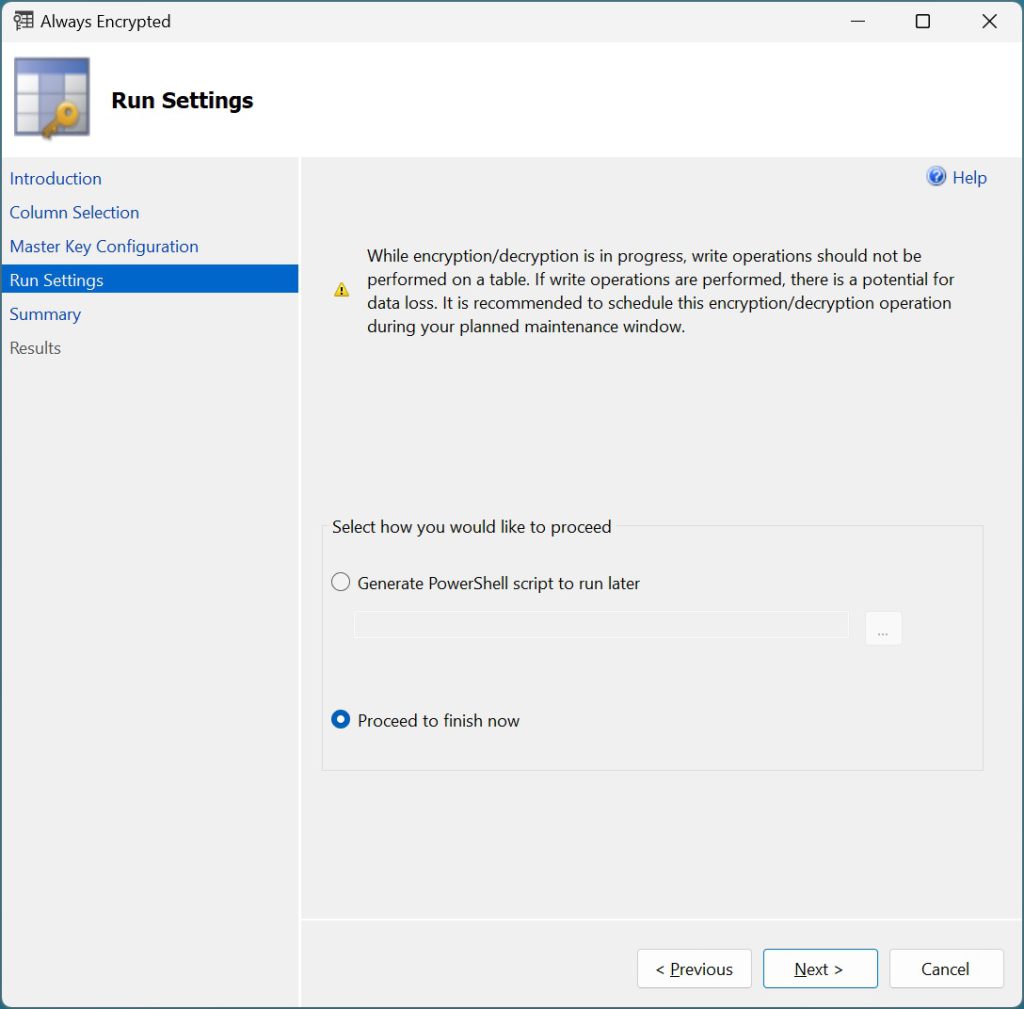 Premendo Avanti verrà visualizzata la finestra che notifica che la tabella dbo.Person verrà bloccata durante il processo di criptazione e si consiglia di schedulare l’attività nelle fasce orarie dedicate alla manutenzione del sistema. La finestra Run Settings è illustrata nella figura seguente.