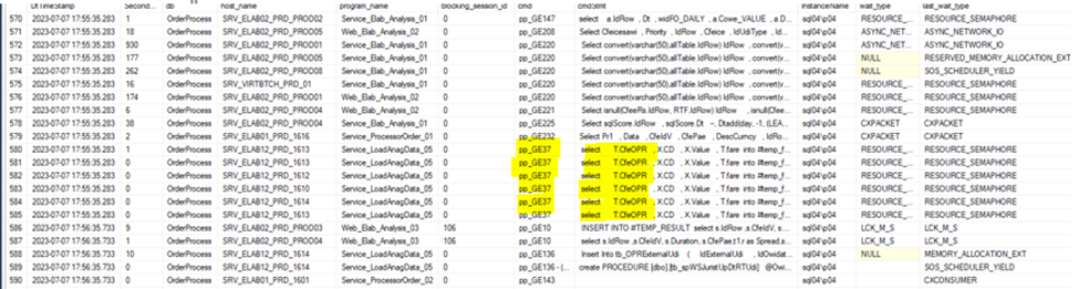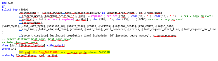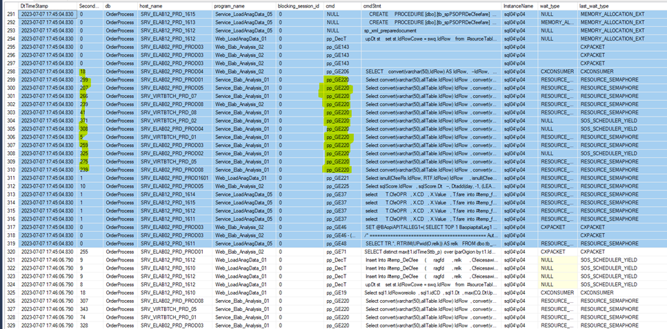 Osservando la figura sopra, si nota che il problema è dato dalla chiamata alla stored “pp_GE220” che esegue lo statement “Select convert(varchar(50),allTable.IdRow) IdRow, convert(varch…” che è troppo invasivo per l’istanza e viene chiamato troppe volte parallelamente. Queste chiamate vengono fatte principalmente dal “program_name=’ Service_Elab_Analysis_01’”. Guardando la colonna “host_name” si vede che questa chiamata è fatta da più macchine differenti. Andando indietro nel tempo ed osservando le registrazioni, si può comprendere che la stessa stored quando viene eseguita al massimo con 3 session parallele, risponde sempre entro 1 minuto. Ciò significa che questa stored fa troppo carico per essere eseguita troppe volte in parallelo. E’ necessario capire se possibile fare tuning nonché insieme agli owner del database quali sono le esigenze relative alle chiamate.