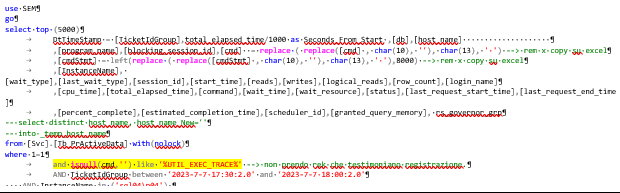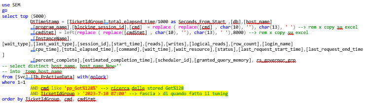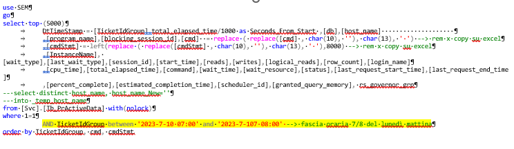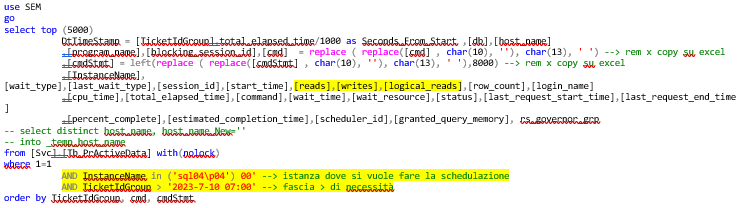 Se è necessario che gli utenti abbiano il sistema disponibile in una fascia oraria di lavoro insolita e\o dedicata alla maintenance è bene fare una query nella stessa fascia oraria la settimana precedente e capire quali sono i comandi che girano, da quali macchine e da quali applicazioni vengono chiamati, sfruttando la baseline delle registrazioni precedenti. Questo permette di analizzare in modo semplice il carico dell’istanza SQL Server e capire se ci possono essere situazioni di blocco in tale fascia oraria causati da maintenance piuttosto che attività batch che in tal caso andranno rischedulate.
