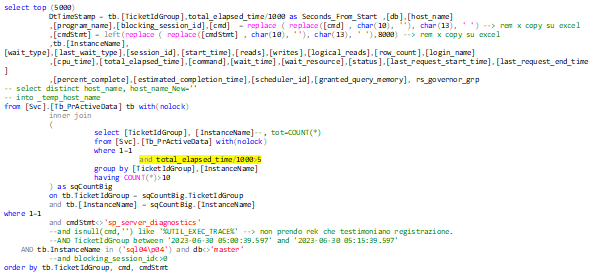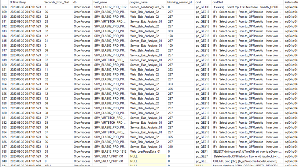 Dalla figura sopra, si nota che la colonna “blocking_sessioni_id” è diversa da 0. Alle 5.01 del 30/06/2023 la session_id=127 sta bloccando altre sessioni_id. Questo permette di comprendere se i comandi vanno lunghi a causa di blocchi e non a causa di lentezza dell’istanza SQL Server e\o di problemi hardware.