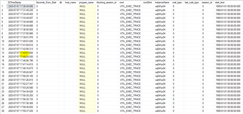 Nell’esempio seguente, viene segnalato che il giorno 7 luglio 2023 ci sono stati rallentamenti nella fascia oraria che va dalle 17.42 alle 17.55 sull’istanza “sql04\p04”. Di seguito viene riportato un esempio di registrazione con la fotografia ogni 1 minuto.
