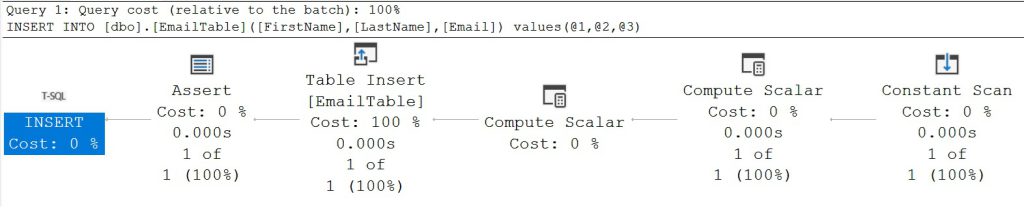 La funzione può essere usata in un CHECK CONSTRAINT perché è deterministica, non accede a oggetti esterni diversi dalla tabella stessa, e lavora correttamente con ANSI_NULLS OFF. La logica (COUNT <= 1) considera il fatto che i CHECK CONSTRAINT vengono verificato dopo l’inserimento dei dati e il record con l’Email da verificare è già all’interno della tabella nel momento della verifica. Il seguente piano di esecuzione è relativo ad un inserimento nella tabella dbo.EmailTable con il vincolo check creato, si osserva che l’operatore Assert esegue il controllo di coerenza dell’integrità di dominio dopo l’operatore Table Insert.